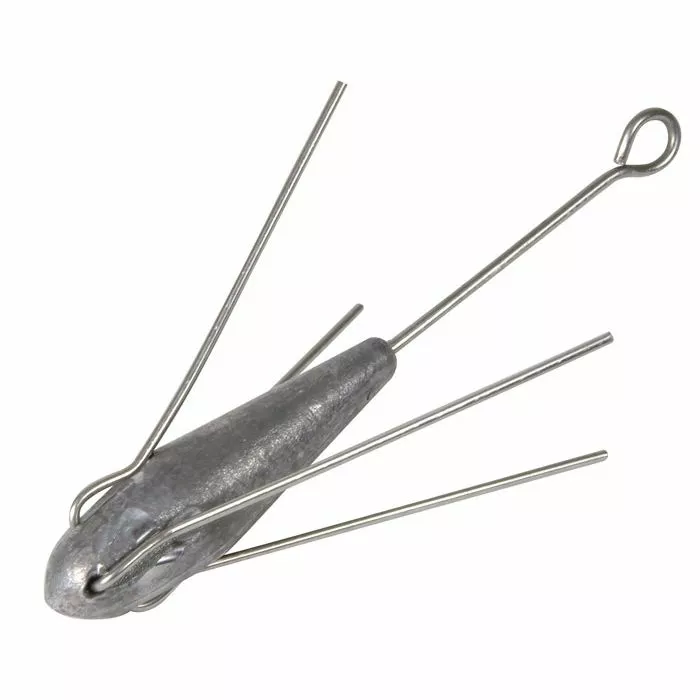 This clever Breakaway Sinker design offers anglers an aerodynamic shape that is excellent for maximising casting distance while also providing good bottom grip with four wire prongs. These prongs can then free the weight from its holding position as the wires ‘break away’, folding back, when a fish strikes or the angler winds in. Breakaway sinkers are popular with beach and rock anglers fishing areas with high water movement and/or areas with seafloors that can cause other sinker shapes to snag on obstructions.