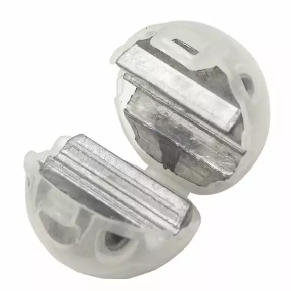 They are made from two lead inserts, which are captured within a resilient plastic shell. The shell has a tough hinge at the rear and a strong latch on the front. The plastic retains the lead within its shell and the hinge allows the sinker to open up and be placed over the fishing line.